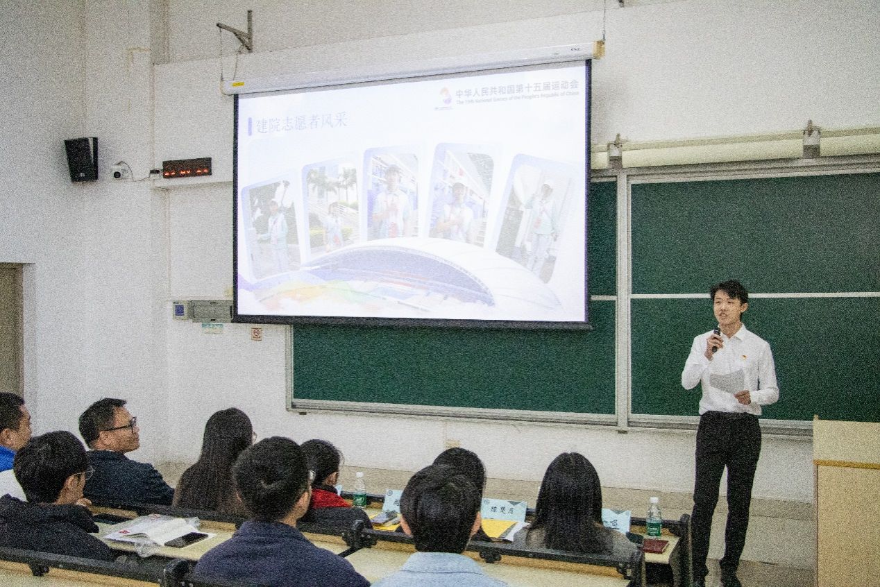 十五运优秀志愿者周晓同学首先向在场同学介绍了我院在十五运会期间所负责的具体志愿服务项目与岗位分工,增进大家对志愿团队的了解。随后,她以个人朋友圈分享为引,娓娓道来担任志愿者期间的收获与回忆——那些交织着汗水与欢笑的日夜,已沉淀为心底最温暖的留恋,也成为她成长路上珍贵的一页。
