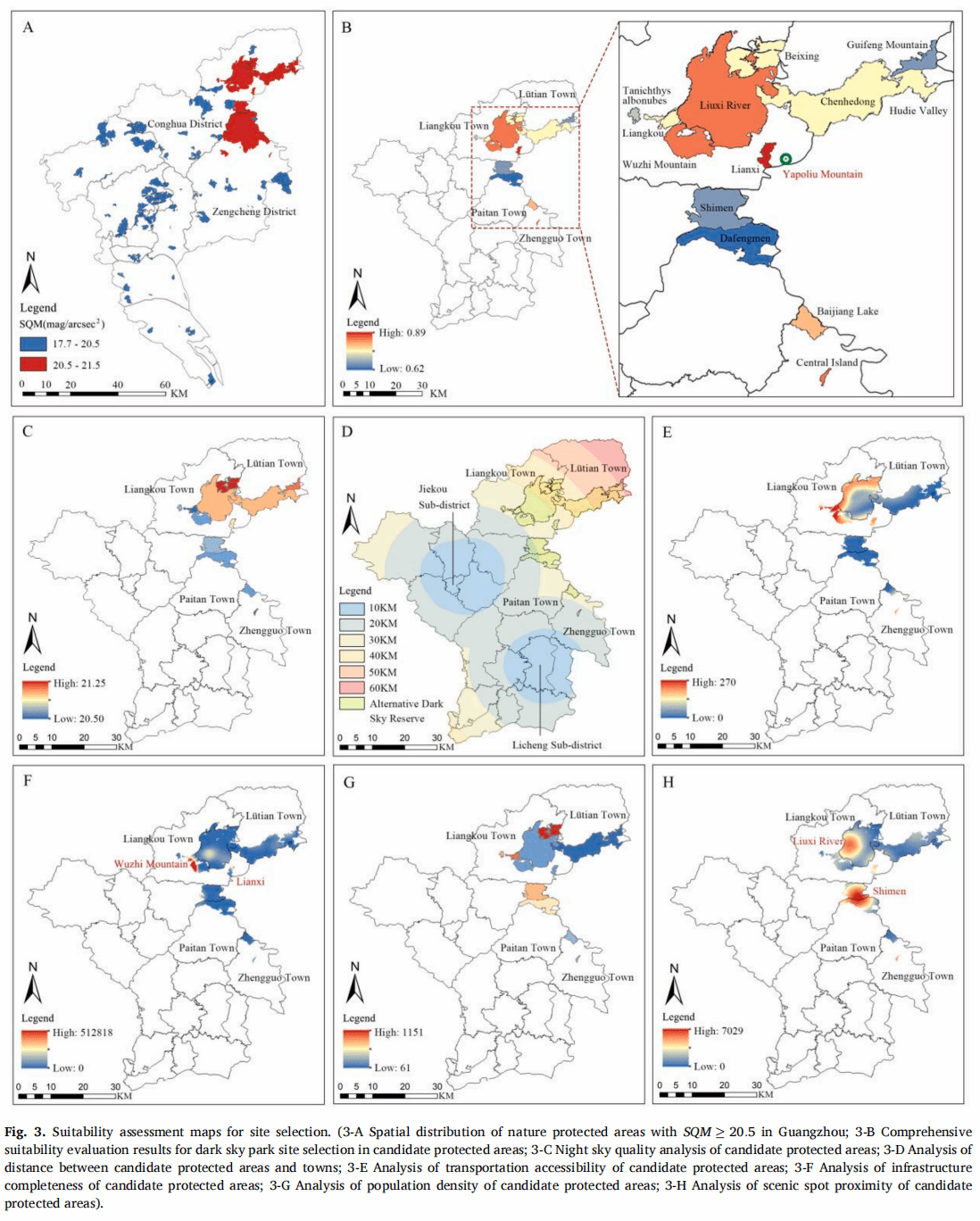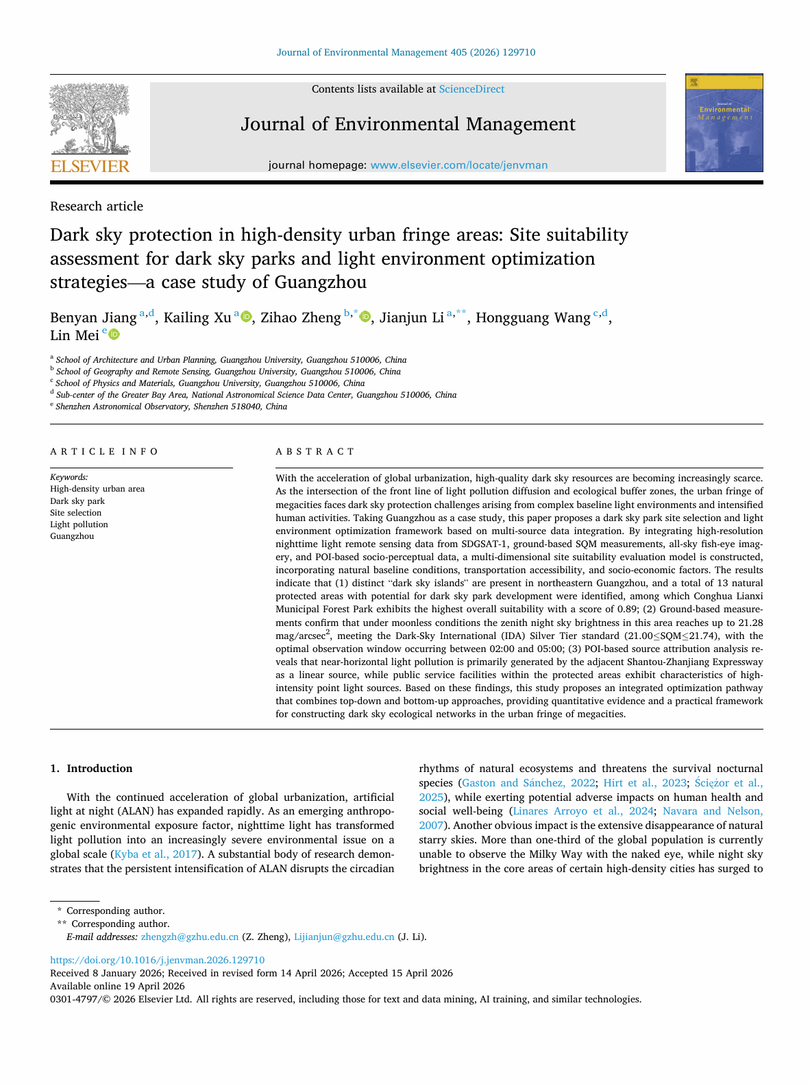 该成果第一作者为我院讲师江本砚,通讯作者为地理科学与遥感学院郑子豪副教授、我院李建军教授,合作者包括我院研究生徐楷灵、物理与材料科学学院王洪光教授、深圳市天文台梅林研究员。论文题为《Dark sky protection in high-density urban fringe areas: Site suitability assessment for dark sky parks and light environment optimization strategies: a case study of Guangzhou》,获得广东省哲学社会科学规划项目、广东省自然科学基金青年项目、广东省科技计划项目和国家自然科学基金项目资助。